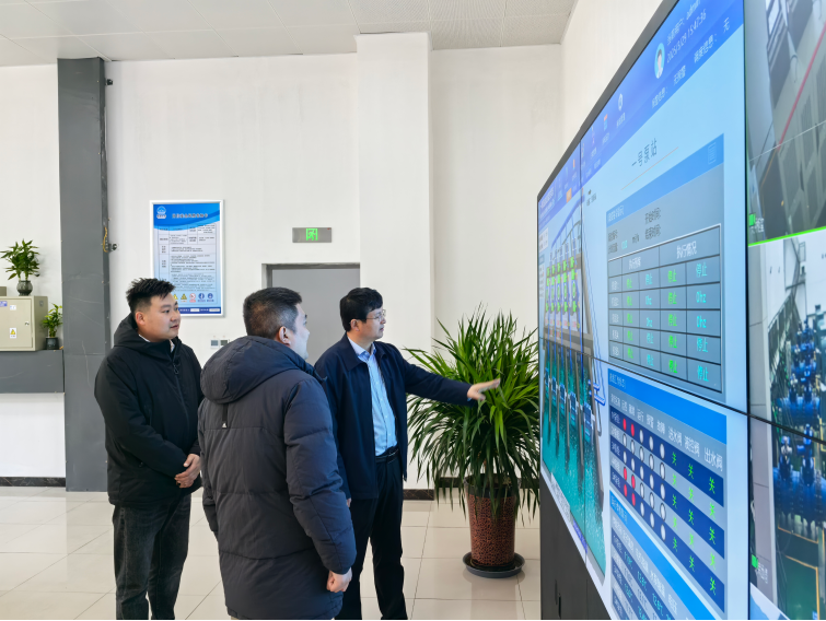 在一號泵站調度中心,通過數字孿生平臺的實時演示,全面了解項目智能化管理系統的運行模式和數據應用效果。魏長學肯定了平臺在優化調度、應急響應等方面的功能,并要求進一步強化技術賦能,提升水務管理的精細化水平。隨后,在二號泵站現場查看主道路施工進展,詳細詢問道路施工的工期節點與難點及施工進度情況,要求工作人員加強監督與管理,在確保安全和質量的前提下,加快推進配套工程建設。最后來到三號泵站,查看了水泵機組及配套設備維護情況,檢查了廠房土建防漏防潮措施,提出要加強巡查及日常點檢,確保泵站各項工作安全進行。